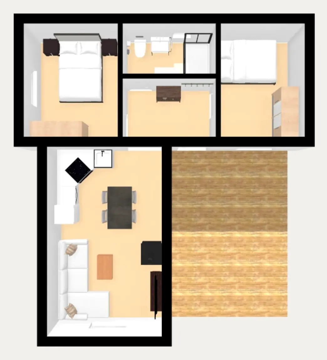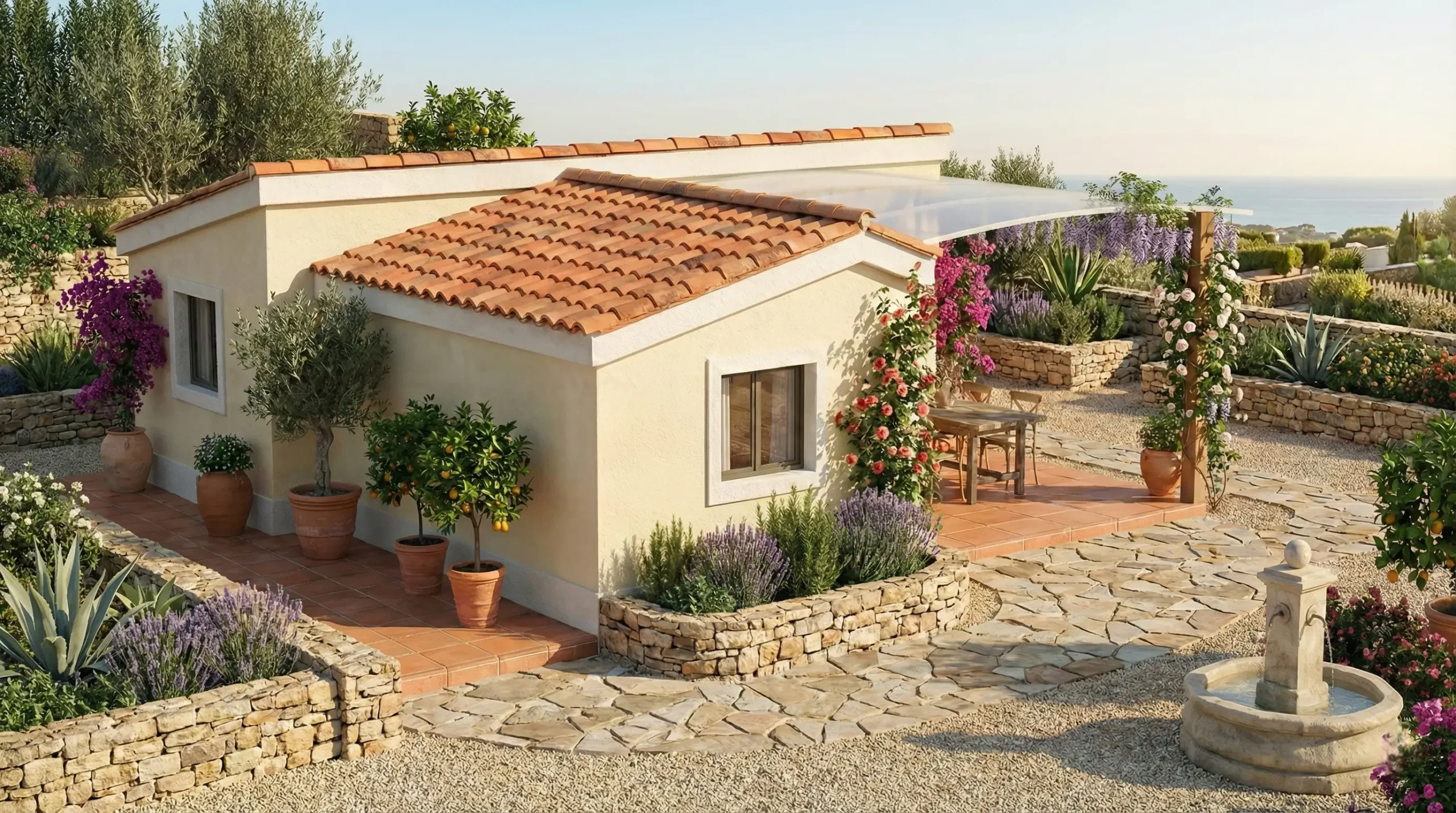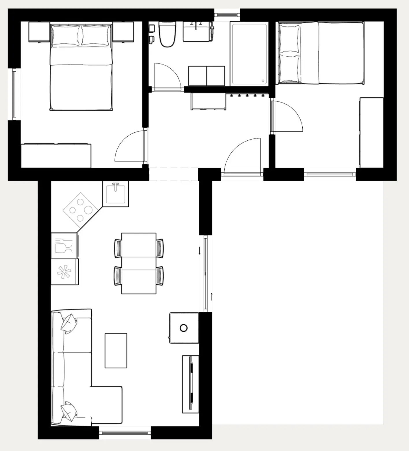 Model Linea predstavlja iskorak prema modernom mediteranskom stilu, karakterističan po svojim razigranim krovnim plohama koje kući daju dinamičan i prepoznatljiv izgled. Njezin tlocrt od 60m2 u obliku slova L nije samo estetski privlačan, već iznimno funkcionalan jer jasno odvaja "dnevnu" od "noćne" zone, pružajući mir i privatnost unutar istog objekta. ​Jedno krilo kuće posvećeno je odmoru s dvije prostrane spavaće sobe i kupaonicom, dok je drugo osmišljeno kao svijetao open-space boravak povezan s kuhinjom. Ključna prednost ovog L-oblika je što sama kuća svojim zidovima prirodno formira i štiti vanjski prostor – stvarajući savršeno "dvorište" u koje se izlazi direktno iz dnevnog boravka. Taj prostor ostavljamo vama na izbor – idealan je za popločanu terasu ili pergolu po vašoj želji. Uz vrhunsku STIROTON izolaciju i kvalitetnu stolariju, Linea je dom stvoren za one koji vole moderni dizajn s potpisom kvalitete.