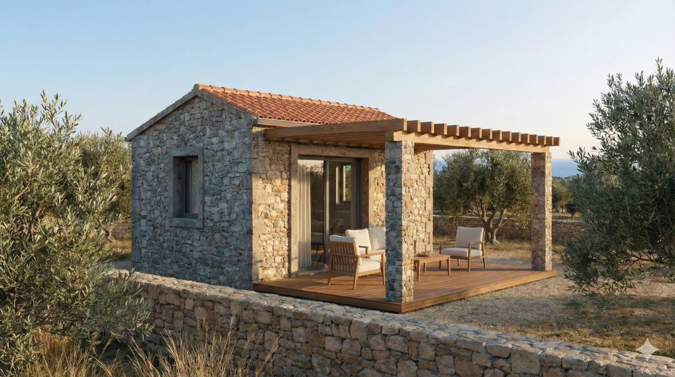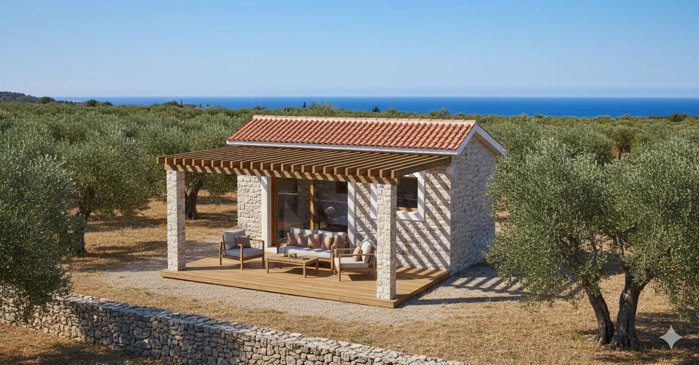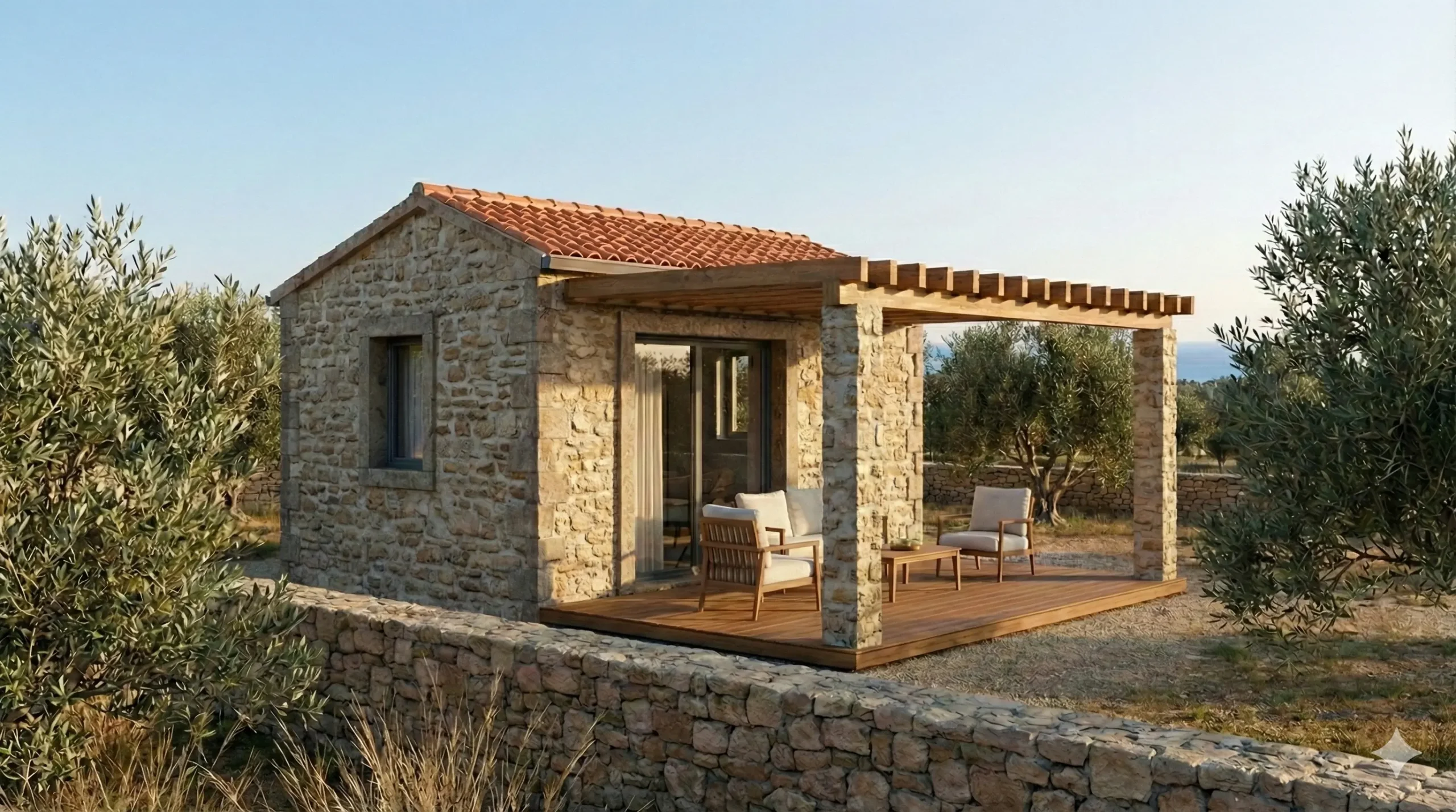 Model Olea utjelovljuje mir i jednostavnost života u samo 35m2 vašeg privatnog maslinika. Njezin kompaktni tlocrt i velika staklena stijena brišu granicu između interijera i prostrane terase pod drvenom pergolom, stvarajući idealno utočište za opuštanje na otvorenom. Tradicionalne zelene škure i tekstura starog kamena savršeno skrivaju vrhunsku STIROTON izolaciju A+ razreda, pružajući autentičan ugođaj tradicije uz beskompromisnu udobnost moderne tehnologije. Savršen je odabir za minimalistički bijeg u prirodu ili kao boutique turistički objekt koji gostima nudi luksuznu intimu.