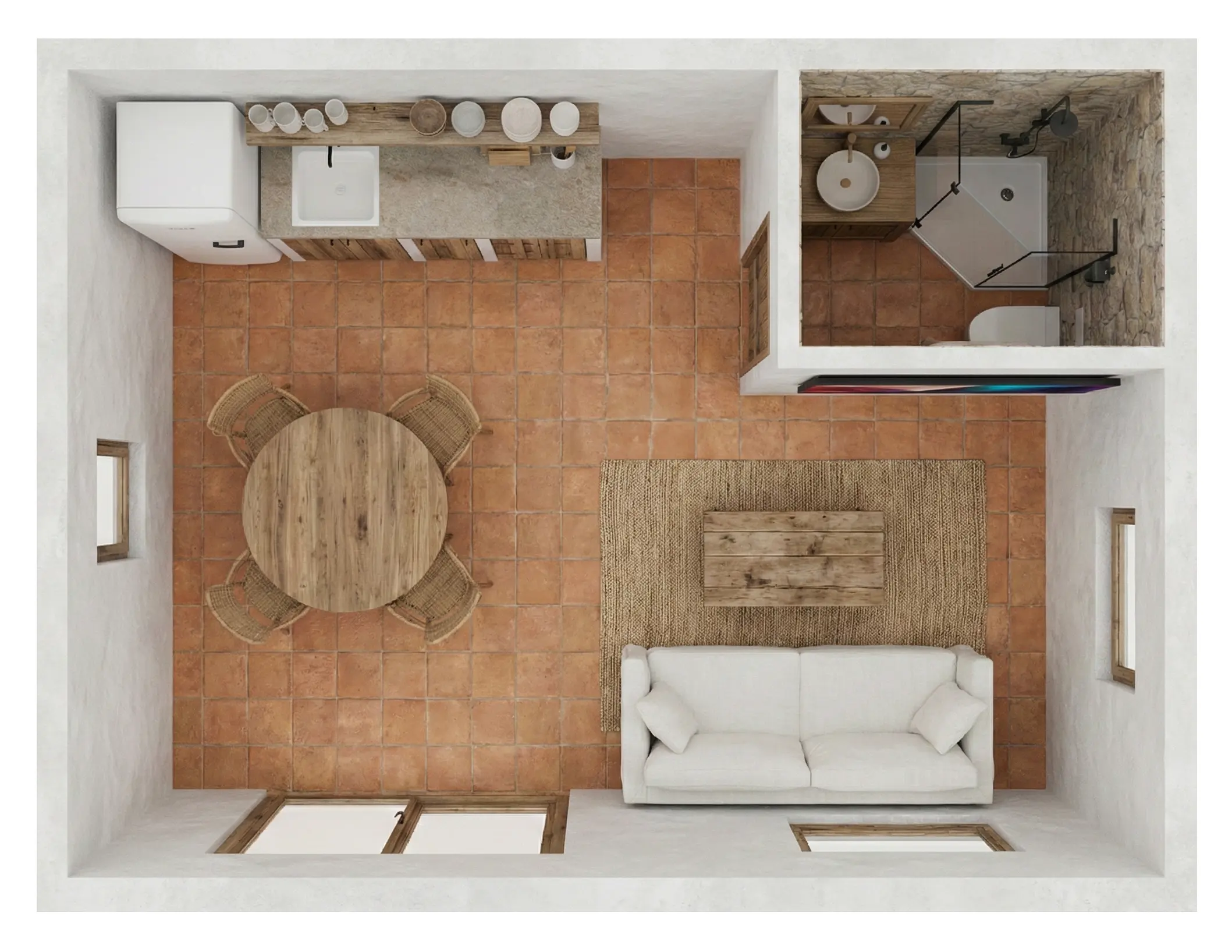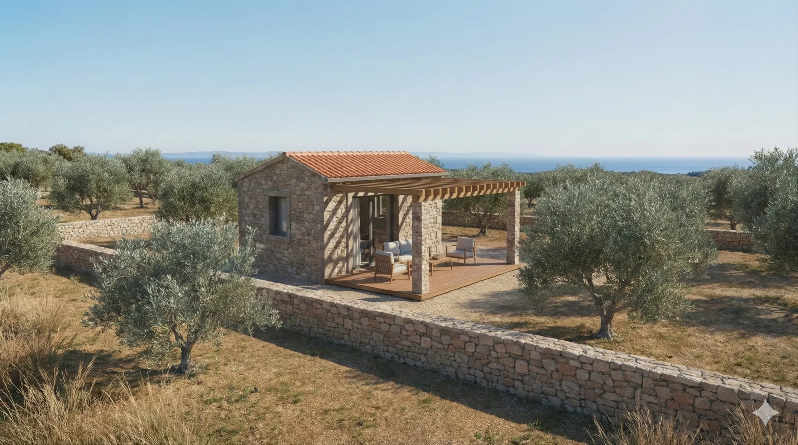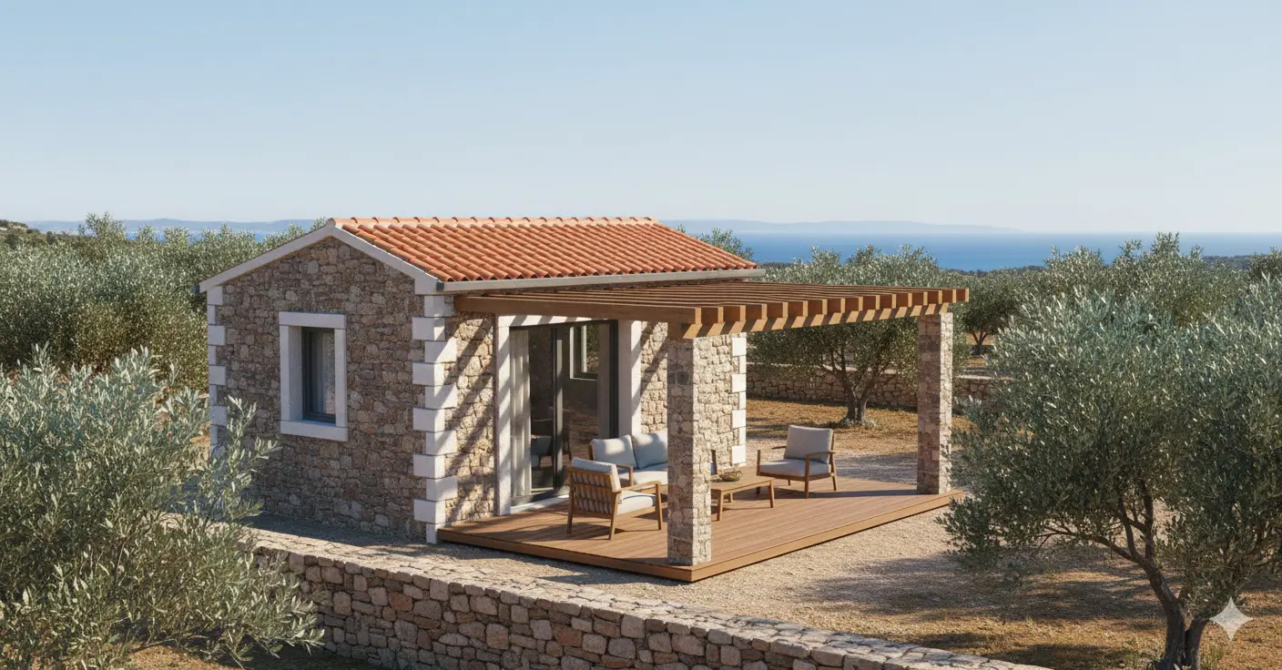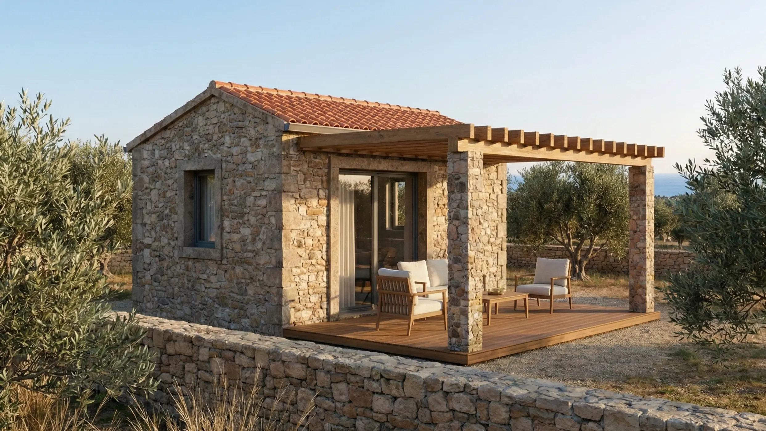 Model Olea utjelovljuje mir i jednostavnost života u samo 35m2 vašeg privatnog maslinika. Njezin kompaktni tlocrt i velika staklena stijena brišu granicu između interijera i prostrane terase pod drvenom pergolom, stvarajući idealno utočište za opuštanje na otvorenom. Tradicionalne zelene škure i tekstura starog kamena savršeno skrivaju vrhunsku STIROTON izolaciju A+ razreda, pružajući autentičan ugođaj tradicije uz beskompromisnu udobnost moderne tehnologije. Savršen je odabir za minimalistički bijeg u prirodu ili kao boutique turistički objekt koji gostima nudi luksuznu intimu.